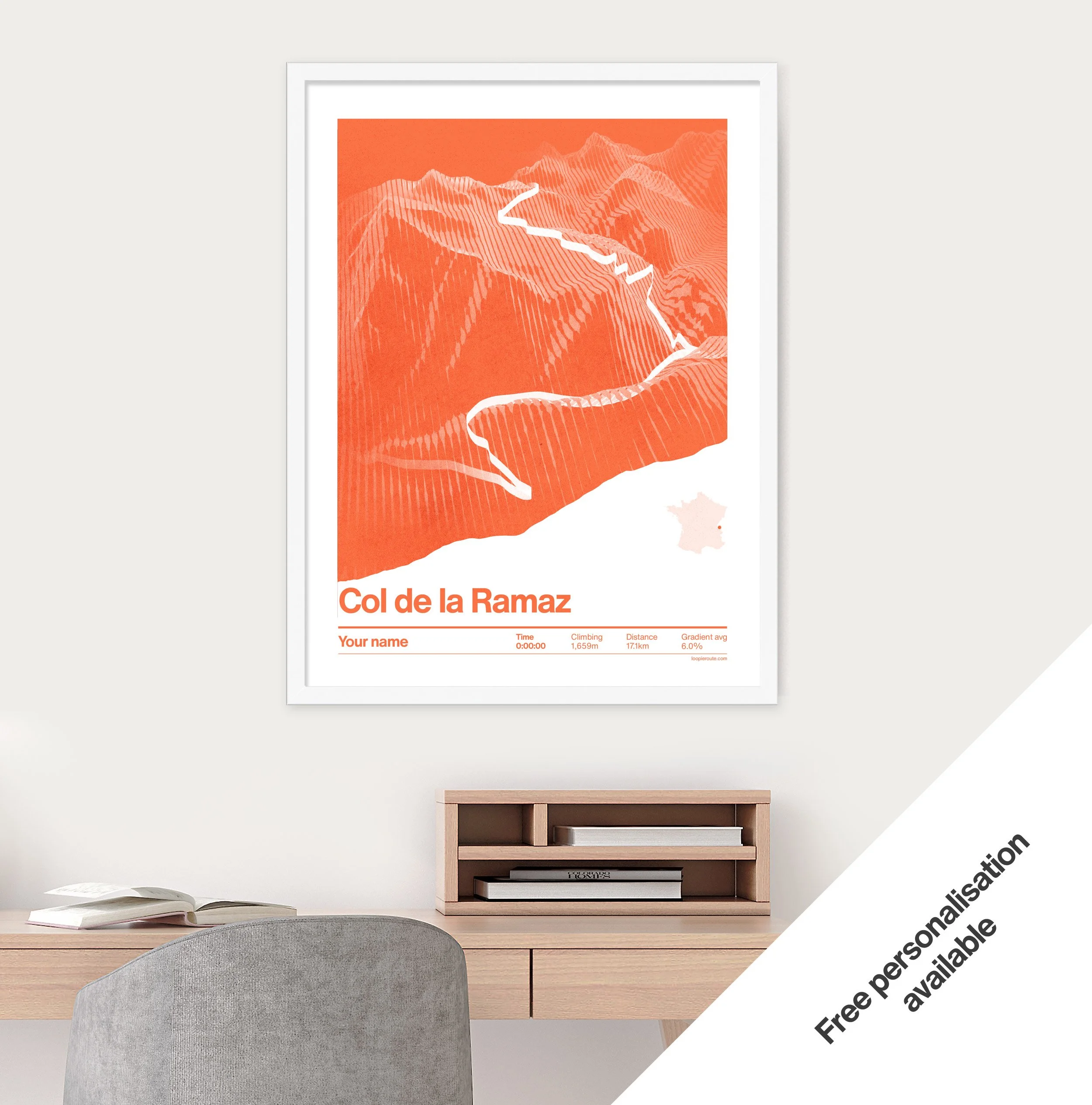 Col de la Ramaz - from taninges climb poster. Celebrate one of France's most iconic mountain climbs. This unique print features a GPS accurate image of the climb, gradient profile, key climb statistics and location map. A fantastic gift for any King or Queen of the mountain. Free optional personalisation also available.